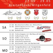 Die Jugendkapelle Breitenbach/Mitgenfeld e.V. wurde im vergangenen Jahr 50 Jahre alt. Viele andere Vereine aus Breitenbach und Mitgenfeld haben ebenfalls ein Jubiläum zu feiern. Das tun wir nun. Am Pfingswochenende, 27. bis 29. Mai 2023, laden wir herzlich zum “Fest der Jubiläen” an den Sportplatz ein. Den Auftakt am Samstag macht das 2. Musikantentreffen der Brückenauer Rhönallianz. Beginn ist hier gegen 17 Uhr. Anschließend spielen die Oberspiesheimer. Der Eintritt ist frei.